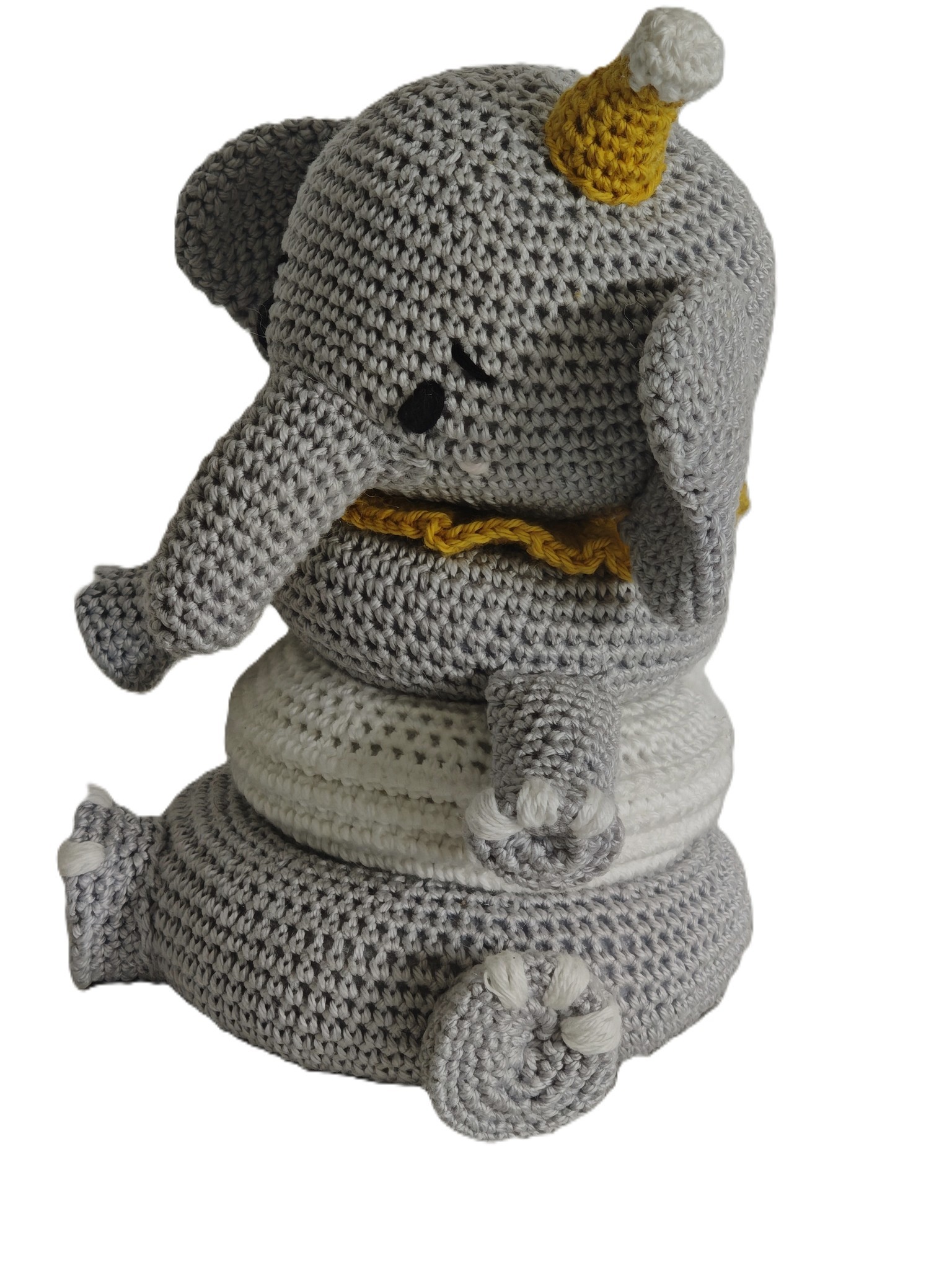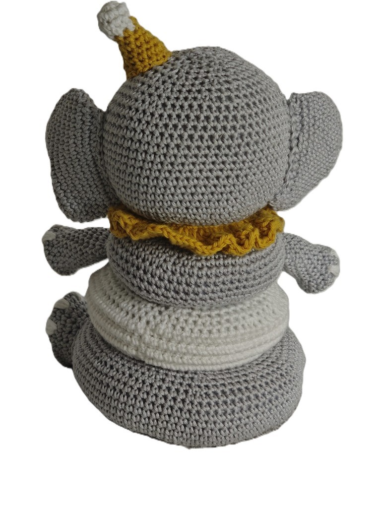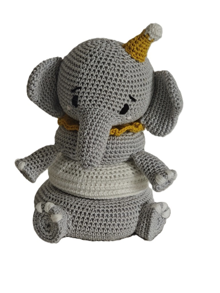 Découvrez ce petit éléphant tout doux, entièrement crocheté à la main, pensé pour accompagner bébé dans ses premières découvertes !