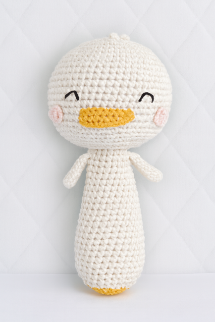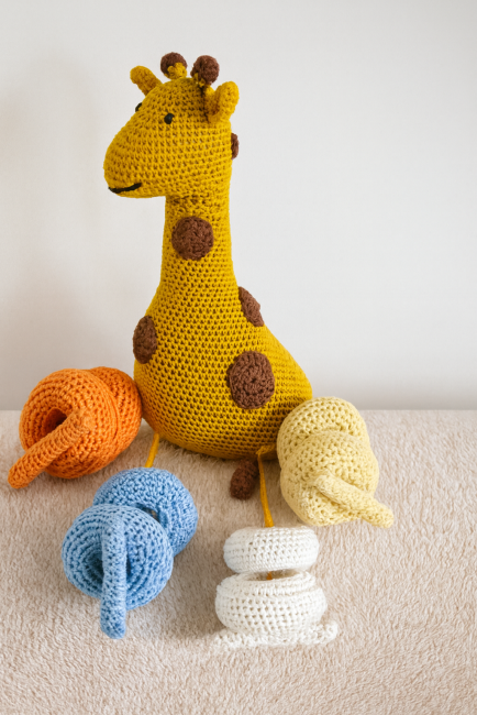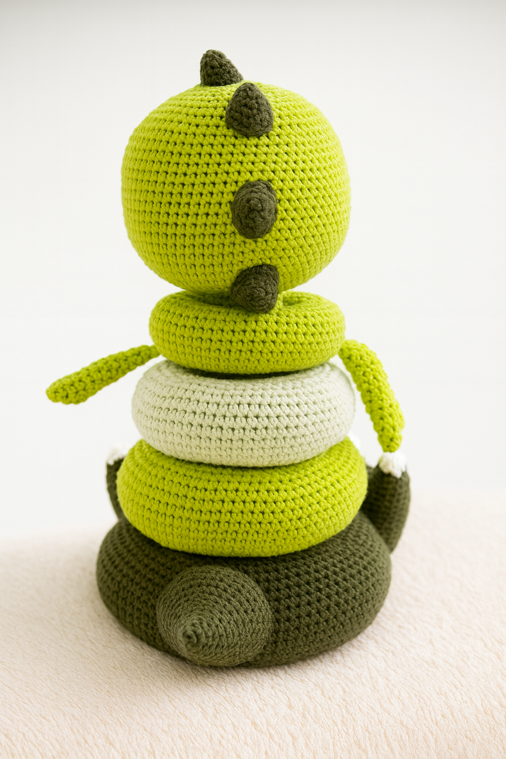 Découvrez ce petit dinausaure tout doux, entièrement crocheté à la main, pensé pour accompagner bébé dans ses premières découvertes !