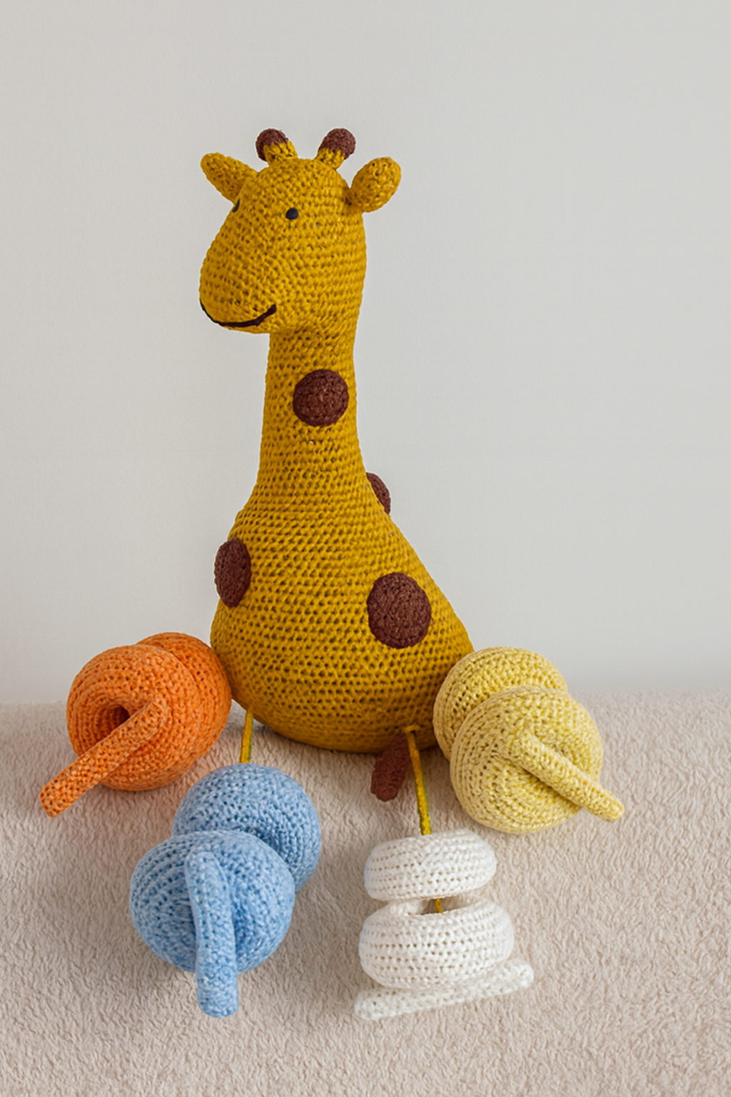 Chaque anneau est crocheté avec soin dans des couleurs douces et contrastées (crème, jaune, bleu, orange…), offrant une expérience sensorielle agréable tout en développant la dextérité de l’enfant. Le corps de la girafe, stable et souple, sert de base ludique et rassurante pour les jeux d’empilement.