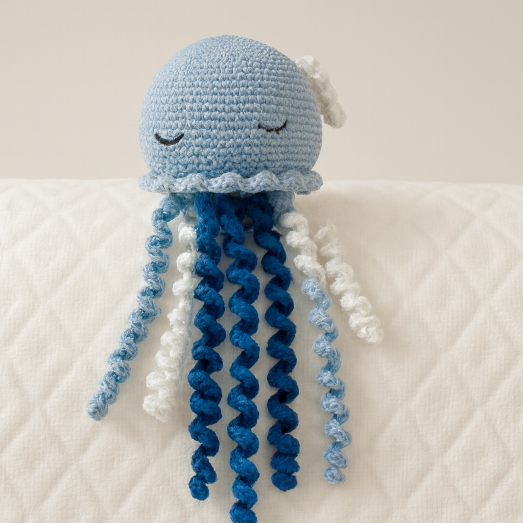 Offrez à votre bébé un compagnon doux et rassurant avec cette pieuvre crochetée à la main, conçue avec amour et minutie. Réalisée en fil de coton naturel, elle est rembourrée avec du watt anti-allergène pour garantir confort et sécurité dès la naissance. Ses yeux sécurisés apportent une touche expressive tout en respectant les normes de sécurité pour les tout-petits.