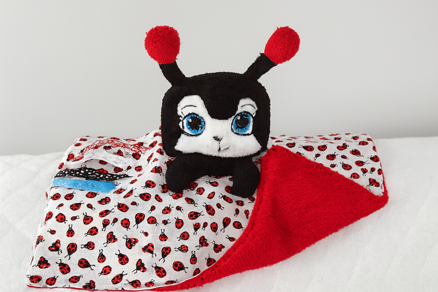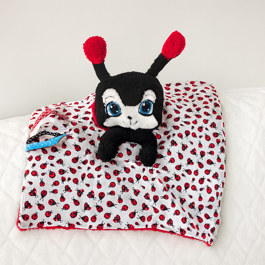 🐞Doudou carré motif coccinelles & peluche brodée – Compagnon éducatif et sensoriel