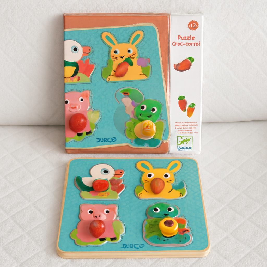 •     Puzzle en bois à encastrement avec 4 pièces à bouton : un canard, un lapin, un cochon et une tortue, chacun associé à un élément (carotte, pomme, fleur…).