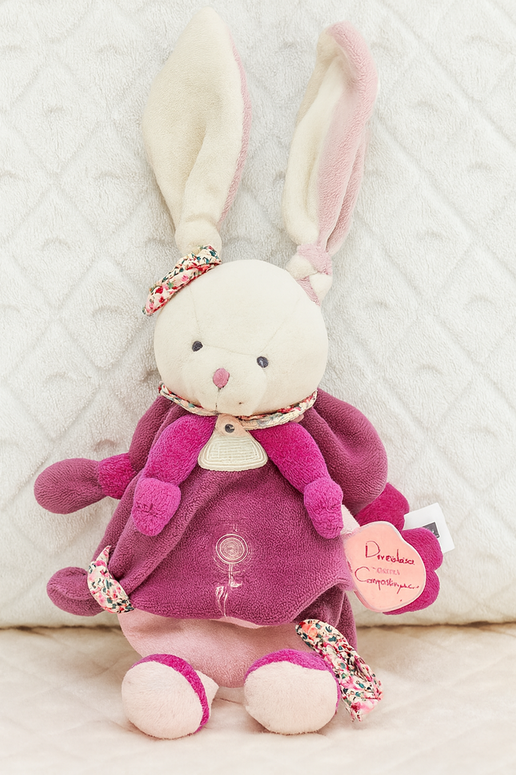 Lapin en peluche violet et rose – seconde main lavée, bon état