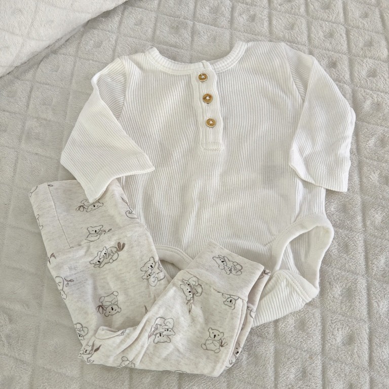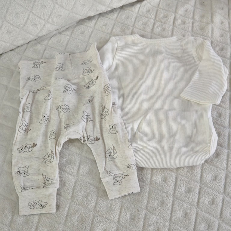 Offrez à votre tout-petit douceur et confort avec cet adorable ensemble de seconde main composé de deux pièces assorties, parfait pour les premiers mois.