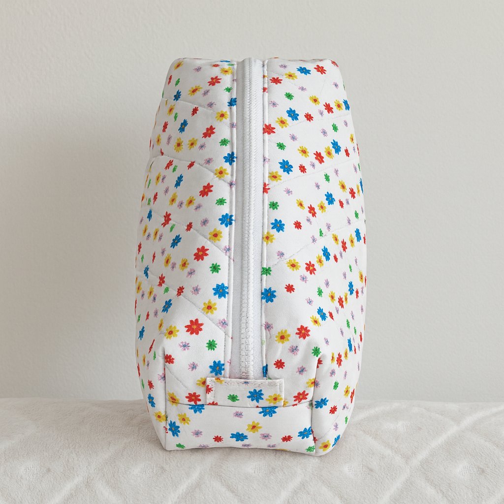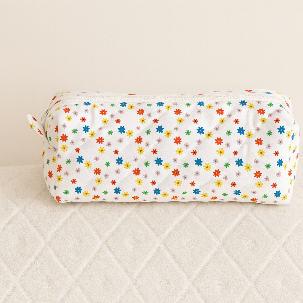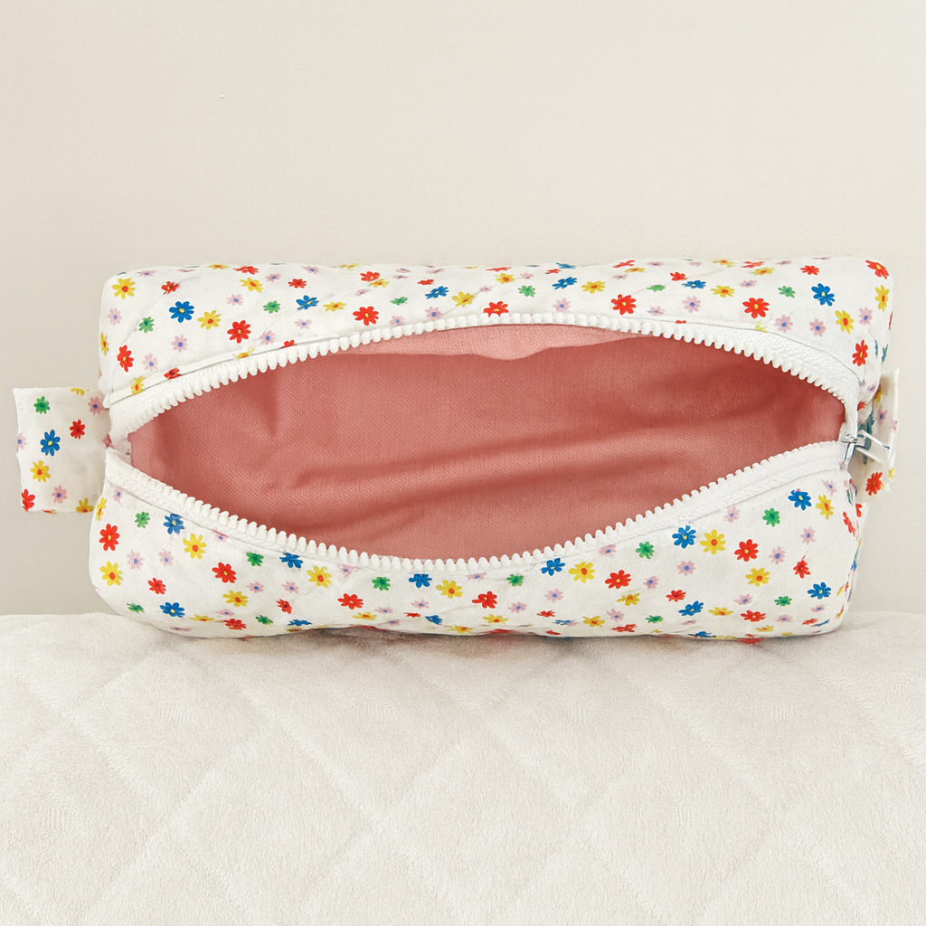 Cette trousse matelassée est confectionnée à la main avec soin, dans un tissu fleuri aux teintes vives et joyeuses.