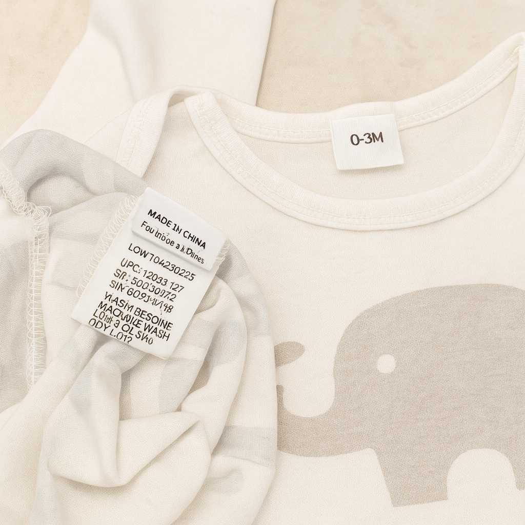 Adorable ensemble coordonné pour bébé, composé d’un body manches longues blanc et d’un pantalon gris à motifs éléphants.