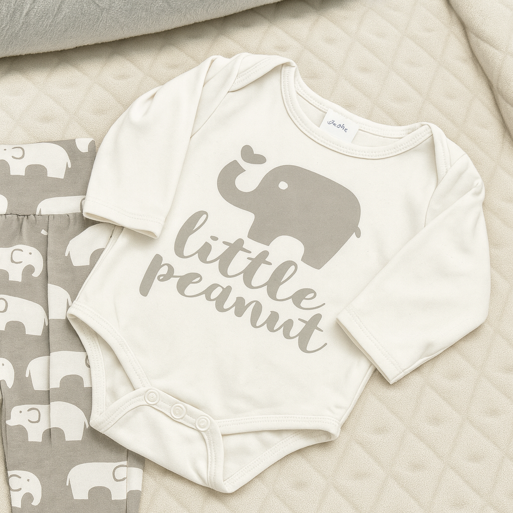 Le body arbore un grand éléphant gris accompagné de l’inscription "little peanut" en écriture cursive, ajoutant une touche tendre et ludique.