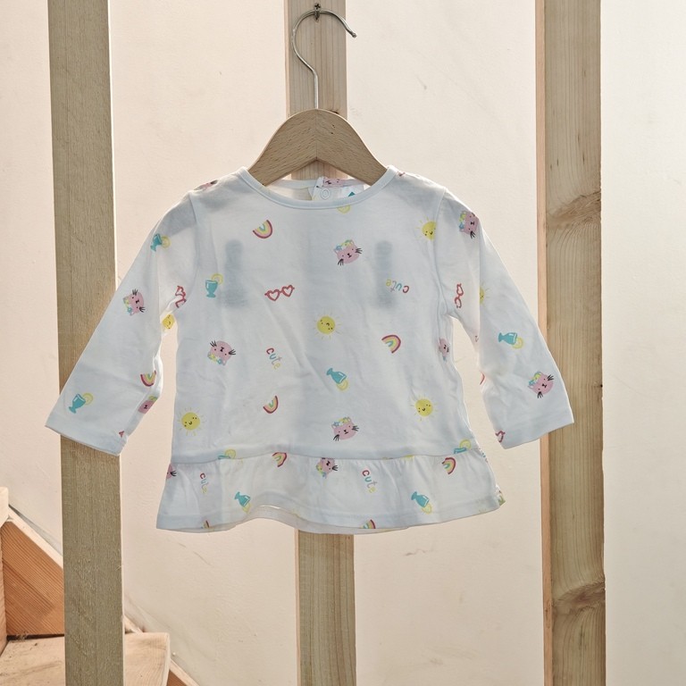 Ce charmant petit haut à manches longues pour bébé fille, taille 6 mois, est une pièce seconde main soigneusement sélectionnée pour sa douceur, sa qualité et son style joyeux.