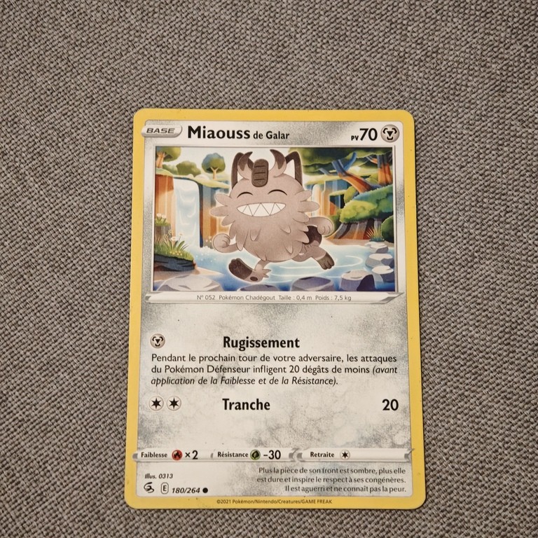 Plongez dans l’univers sauvage et mystérieux de Galar avec cette carte Pokémon à collectionner : Miaouss de Galar, numéro 180/264, issue de l’édition 2021.