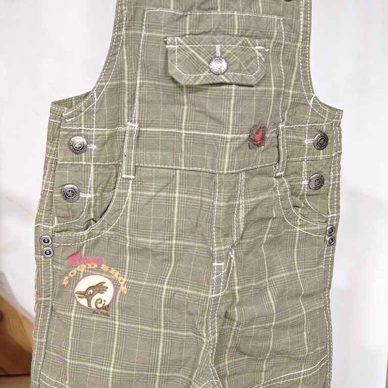- Motifs : Carreaux verts et blancs, patch brodé « Dino Land » sur la jambe gauche, impression ludique « The Original FOOD SHOP No. 5798 »