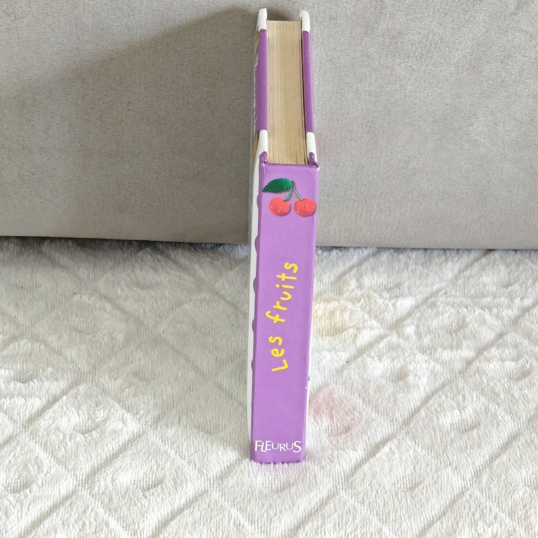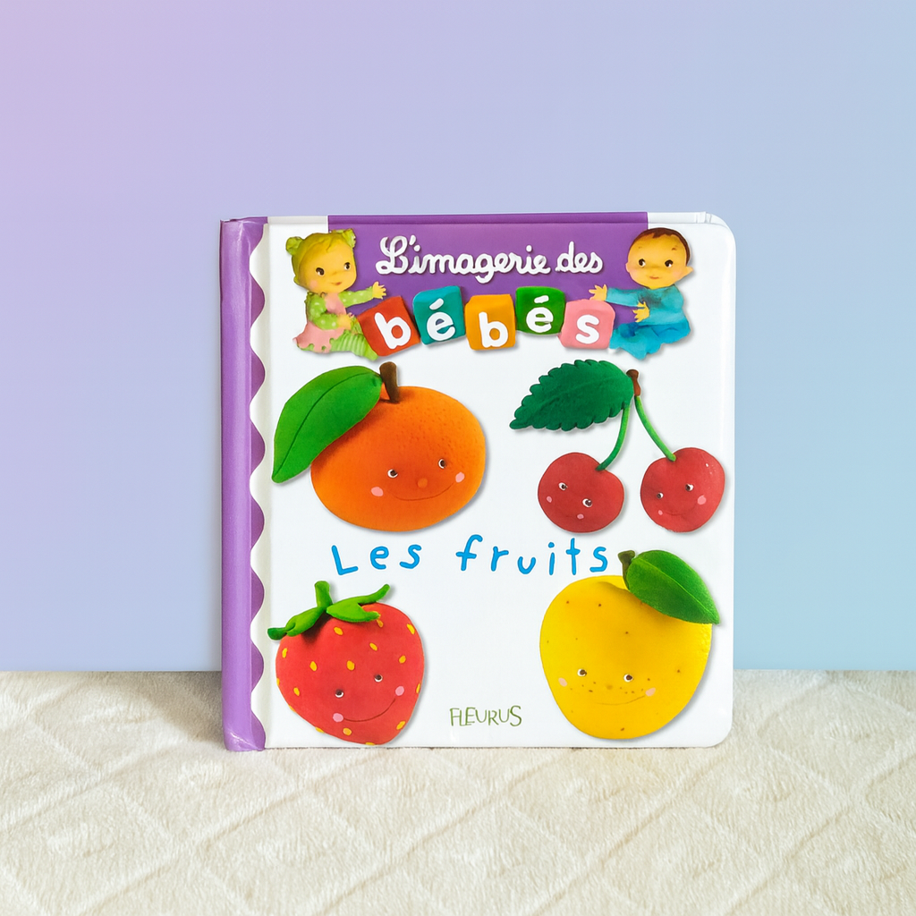 Conçu spécialement pour les bébés dès 6 mois, ce livre cartonné aux coins arrondis présente des illustrations douces et colorées de fruits souriants, accompagnées de mots simples en français pour enrichir le vocabulaire dès le plus jeune âge.