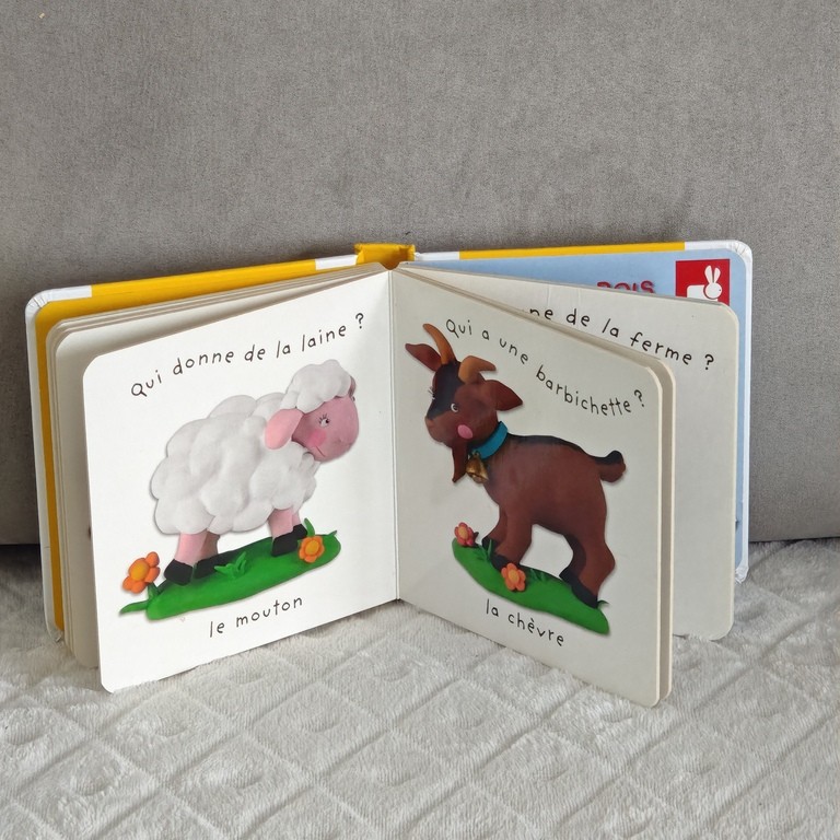 Ce livre est idéal pour une première découverte des animaux de la ferme, avec des questions-réponses ludiques comme « Qui donne de la laine ? » ou « Qui a une barbichette ? », accompagnées d’illustrations tendres et expressives.