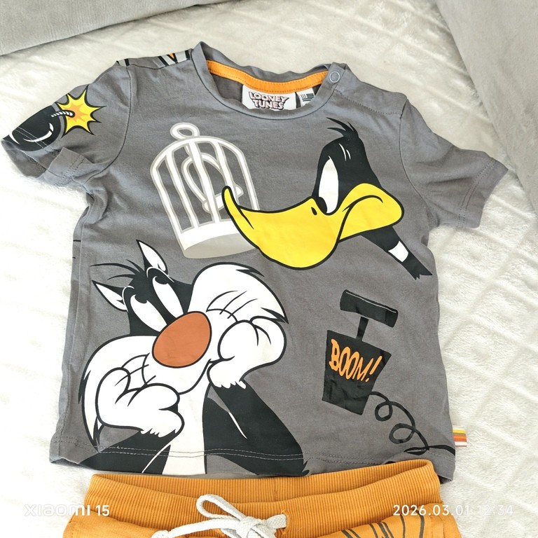 Il se compose d’un T‑shirt gris illustré de personnages emblématiques (Daffy Duck, Sylvestre, Bugs Bunny, Taz…) et d’un short orange assorti, décoré de grands motifs cartoon.