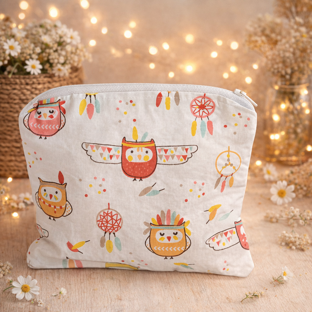 Son tissu extérieur met en scène de mignons hiboux illustrés dans un univers bohème, entourés de plumes, de motifs doux et de dreamcatchers colorés. Les teintes pastel – ocre, turquoise, rouge doux, beige et touches de brun – créent une ambiance chaleureuse et poétique, parfaite pour un cadeau ou pour se faire plaisir.