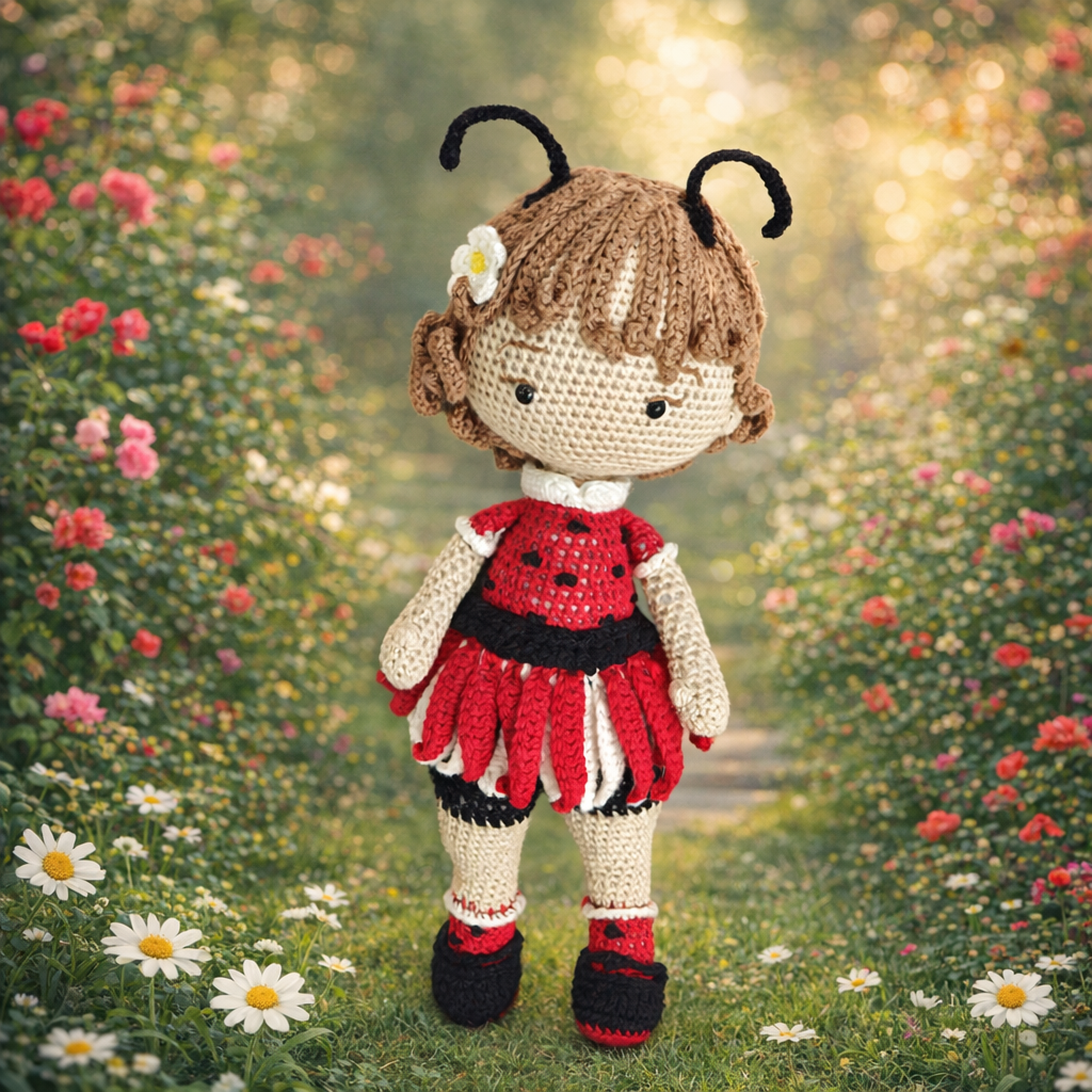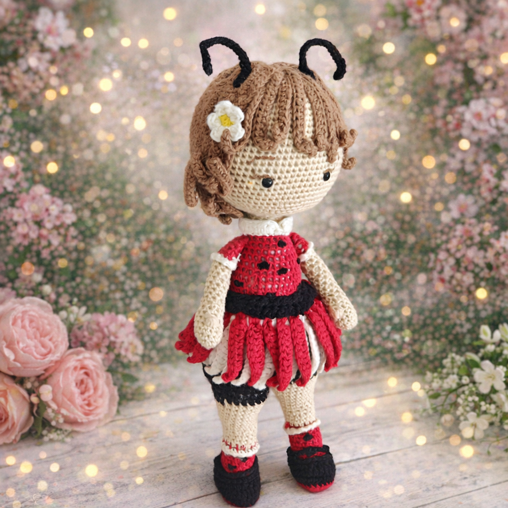 Poupée coccinelle artisanale en coton crocheté – 32 cm de douceur