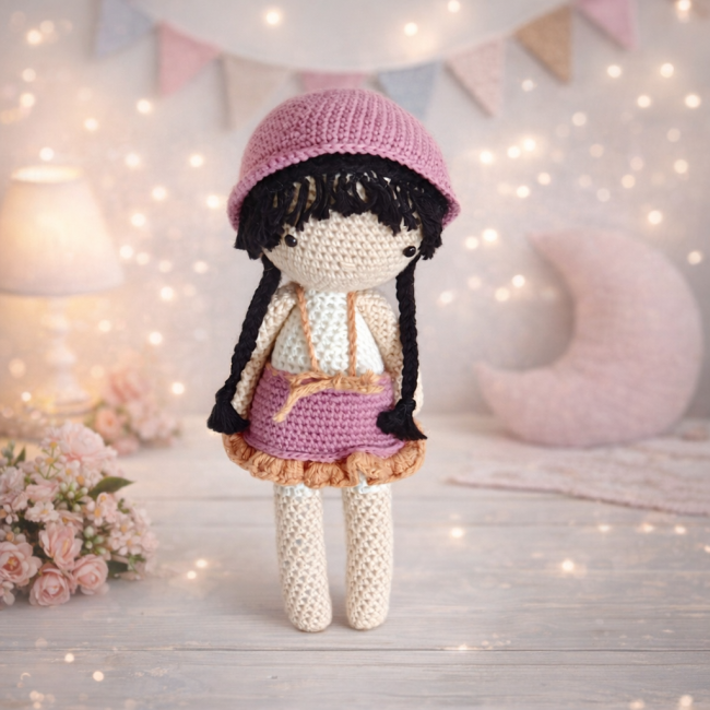 Poupée artisanale au crochet – 26 cm – vêtements et chaussures amovibles
