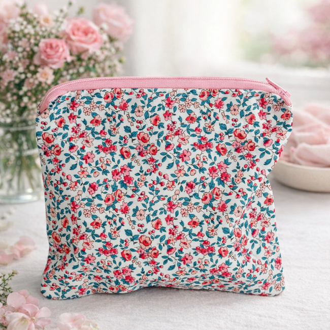Trousse artisanale fleurie – 18 × 19 cm – Fermeture zippée rose