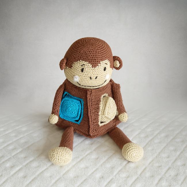 🧸 Singe en crochet éducatif – Jouet artisanal 33 cm avec poche à formes et rembourrage anti-allergène