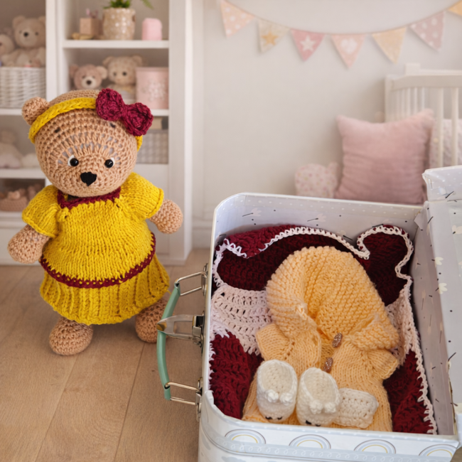 🧸 Ensemble doudou complet – Abricot, moutarde et bordeaux – avec mallette de rangement